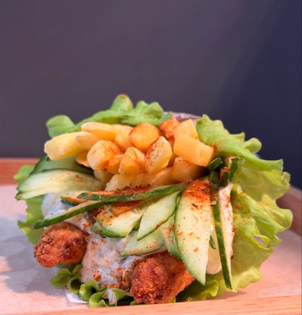 Пита,салатный лист,креветка темпура,соус тар-тар,свежий огурец,фри,паприка