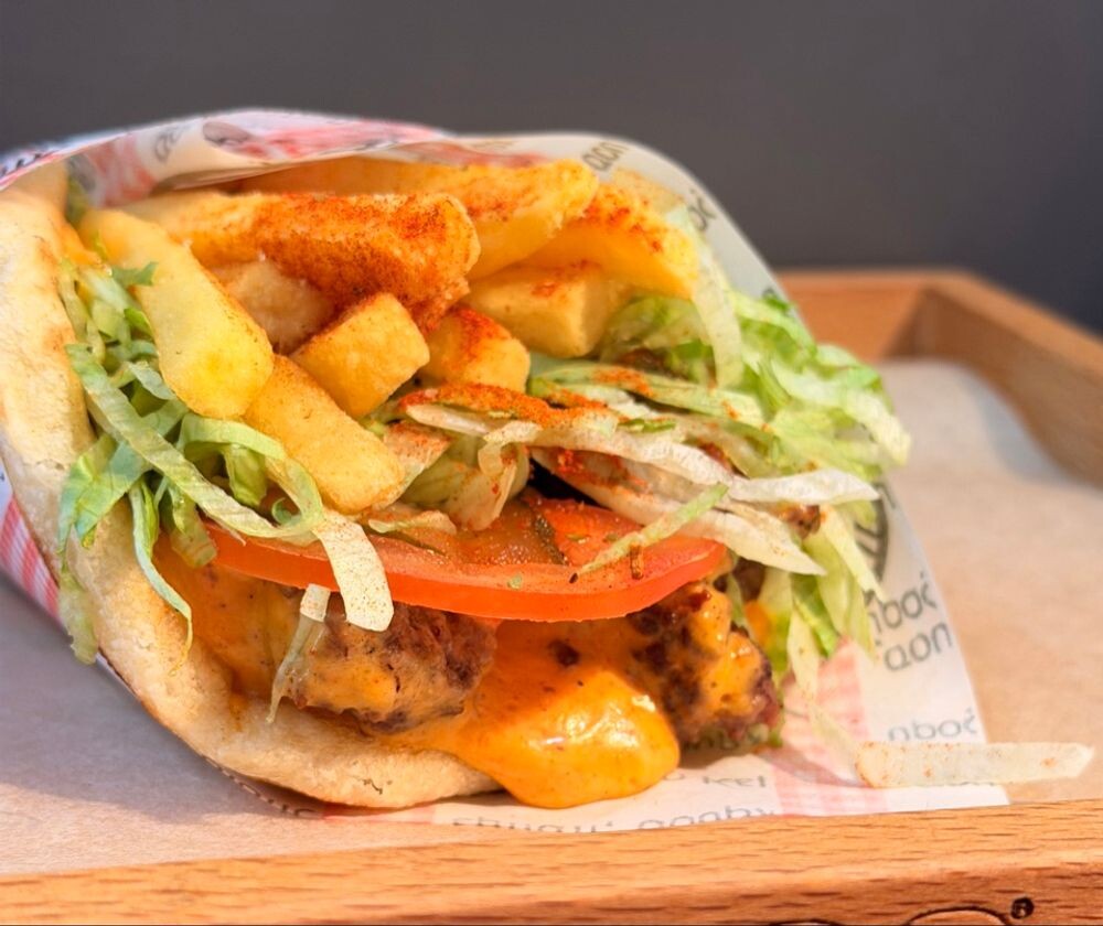 Пита, фри,паприка,говядина, помидоры, соленые огурцы,соус от шефа, салат айсберг