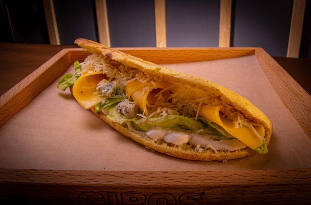 Киприяки, сыр сливочный, салат айсберга, сыр голландский, сыр дор блю, соус цезарь, сыр пармезан