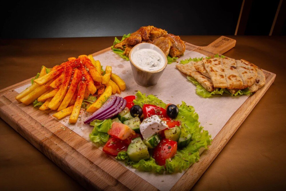 Пита, свиная шейка, соус дзадзики, лук красный, помидоры, фри, паприка , орегано