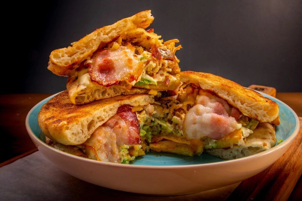 Две питы, голландский сыр, куриное филе, бекон, соус мустарда, помидор, салат айсберг, фри, паприка, орегано