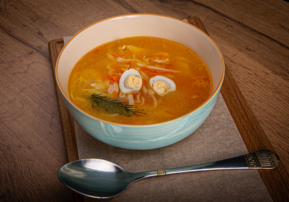 (куриная грудка, морковь, лук, домашняя лапша, яйцо перепелиное)