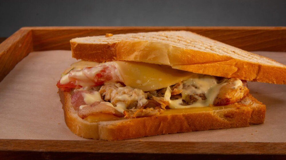 Хлеб тостовый, сыр голландский, курица, бекон, помидор, салат айсберг, желтый соус.