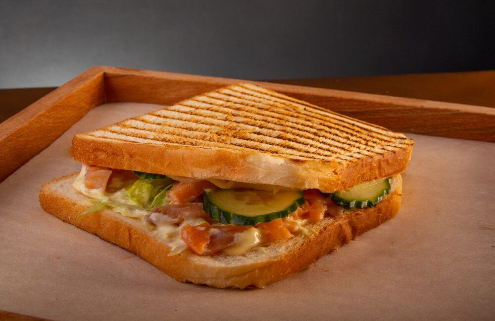 Хлеб тостовый, сыр голландский, филе сёмги, огурец, салат айсберг, желтый соус.