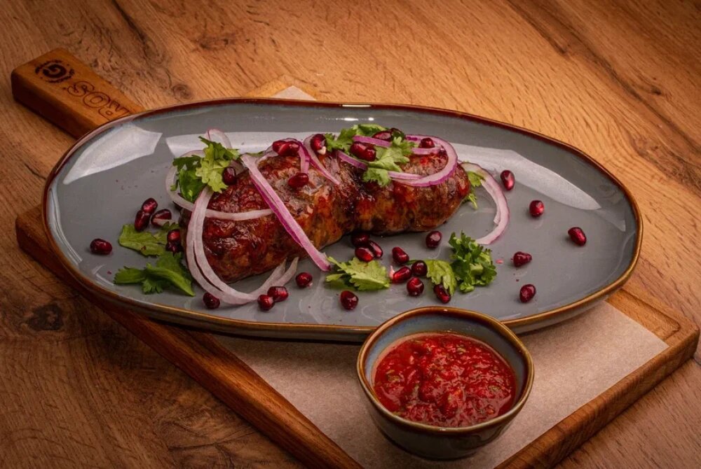 Мясо, лук репчатый, чеснок, зёрна граната (или барбарис), уцхо‑сунели, чабер, базилик, кориандр, перец чёрный, перец красный, соль, жировая сетка (сальник).