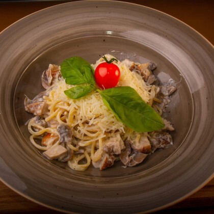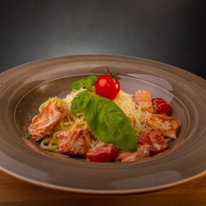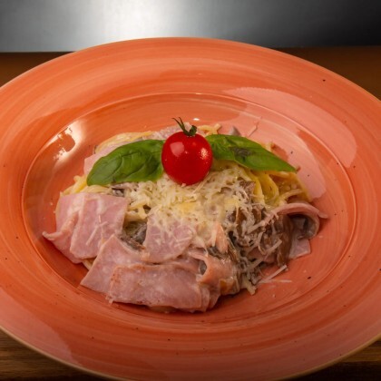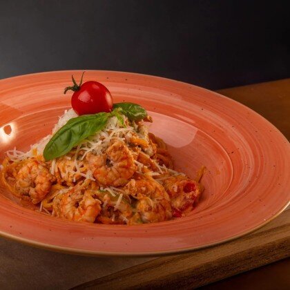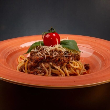 Пата спагетти, соус томатный, черри, цукини, перец болгарский, лук красный