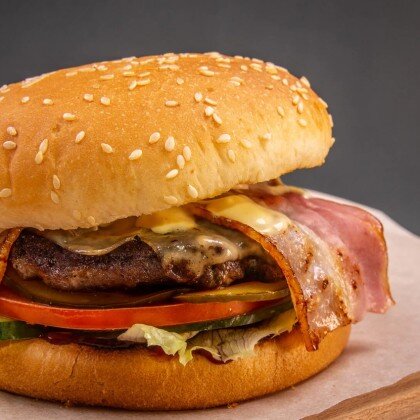 Перец халапеньо, булочка с кунжутом, котлета из мраморной говядины, бекон, (2 вида соуса: барбекю, ранч), салат айсберг, огурцы свежие, огурцы соленые, помидоры, красный лук