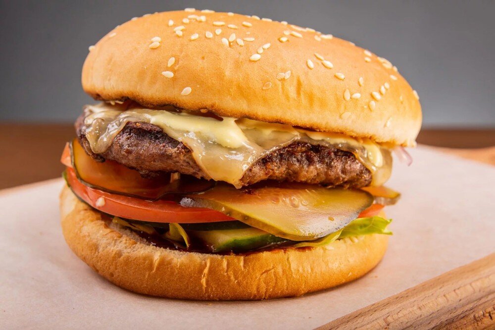 Булочка с кунжутом, котлета куриная, (2 вида соуса: кисло-сладкий, ранч), салат айсберг, огурцы свежие, помидоры, красный лук