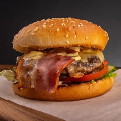 Булочка с кунжутом, котлета из мраморной говядины, (2 вида соуса: барбекю, ранч), салат айсберг, огурцы свежие, огурцы соленые, помидоры, красный лук