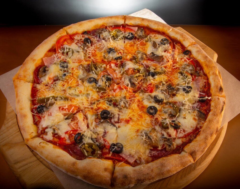 Тонкое итальянское тесто, соус, смесь сыров, салями, пеперони, ветчина ,паприка, помидор, пармезан, халапеньо, грибы, маслины. Диаметр: 32 см.