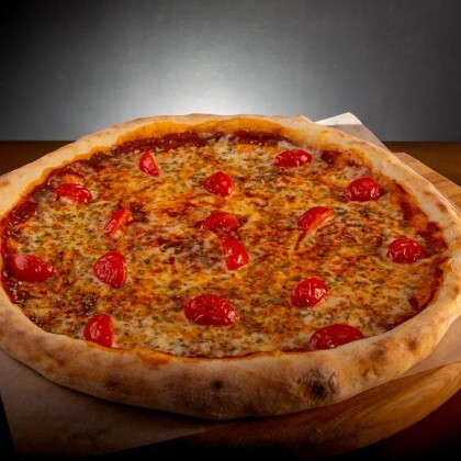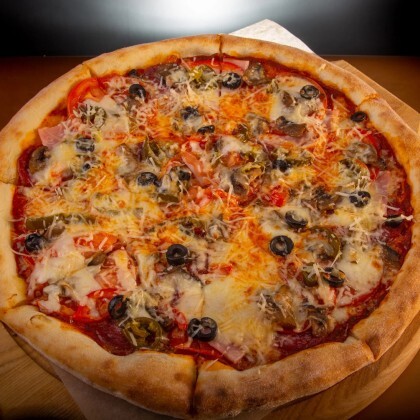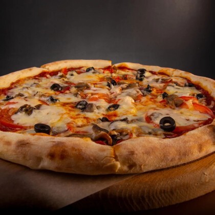 Тонкое итальянское тесто, соус, смесь сыров, помидор, перец, маслины, грибы, лук красный. Диаметр: 32 см.