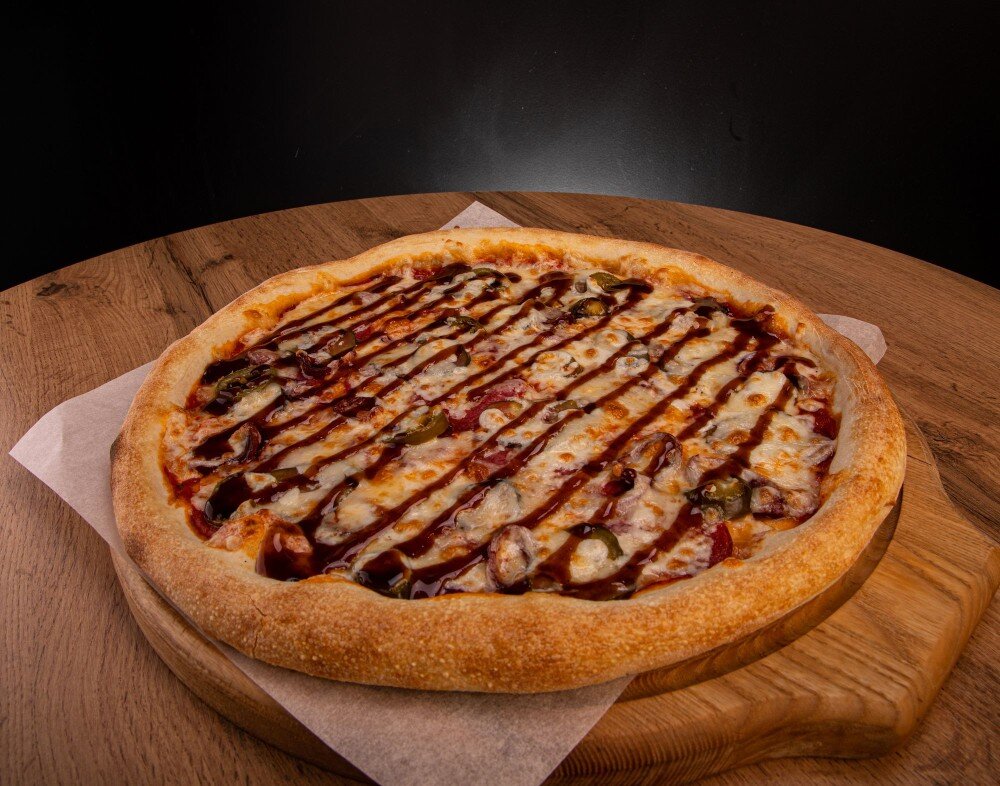 Тонкое итальянское тесто, пицца соус, смесь сыров, пеперони, охотничьи колбаски, соленные огурцы, халапеньо, красный лук, соус барбекю. Диаметр: 32 см.