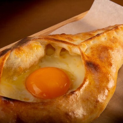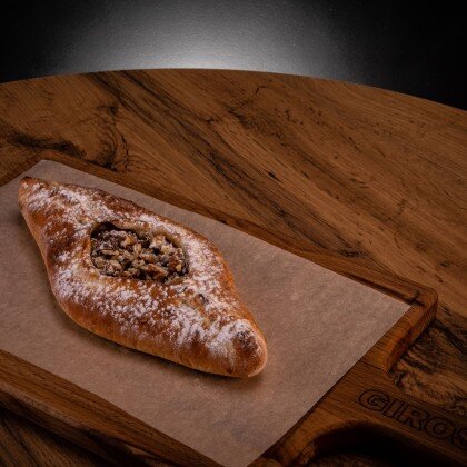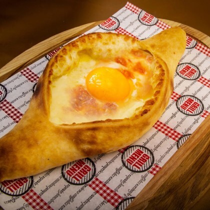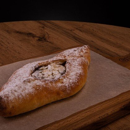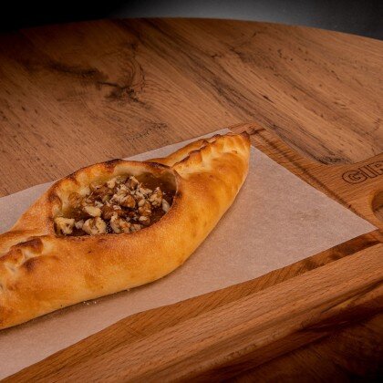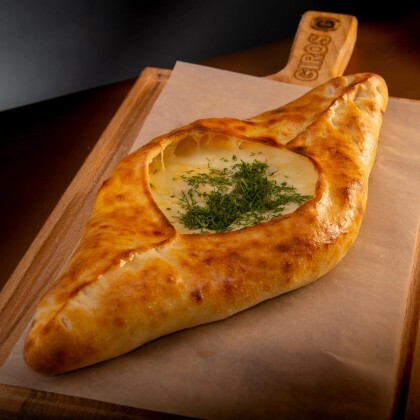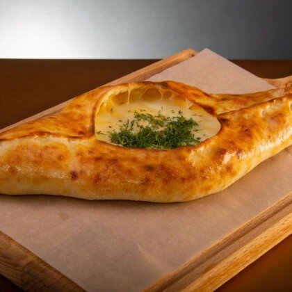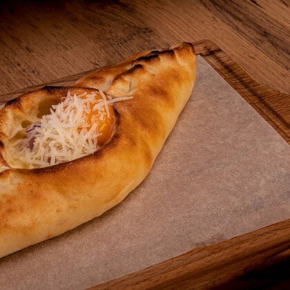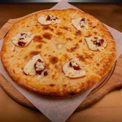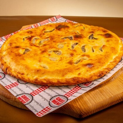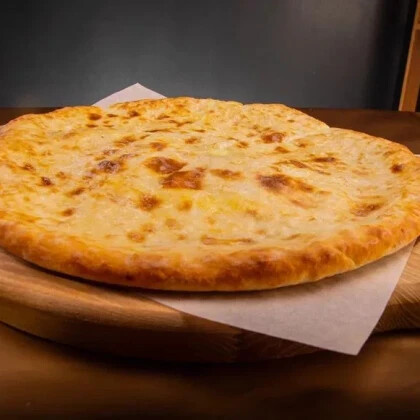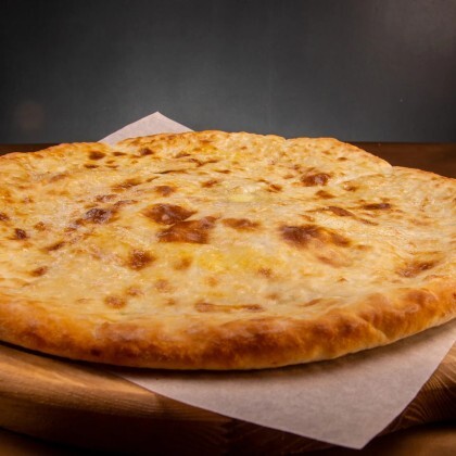 Пышное тесто для хачапури, сыр сулугуни, шпинат, ассорти зелень. Диаметр: 32 см.
