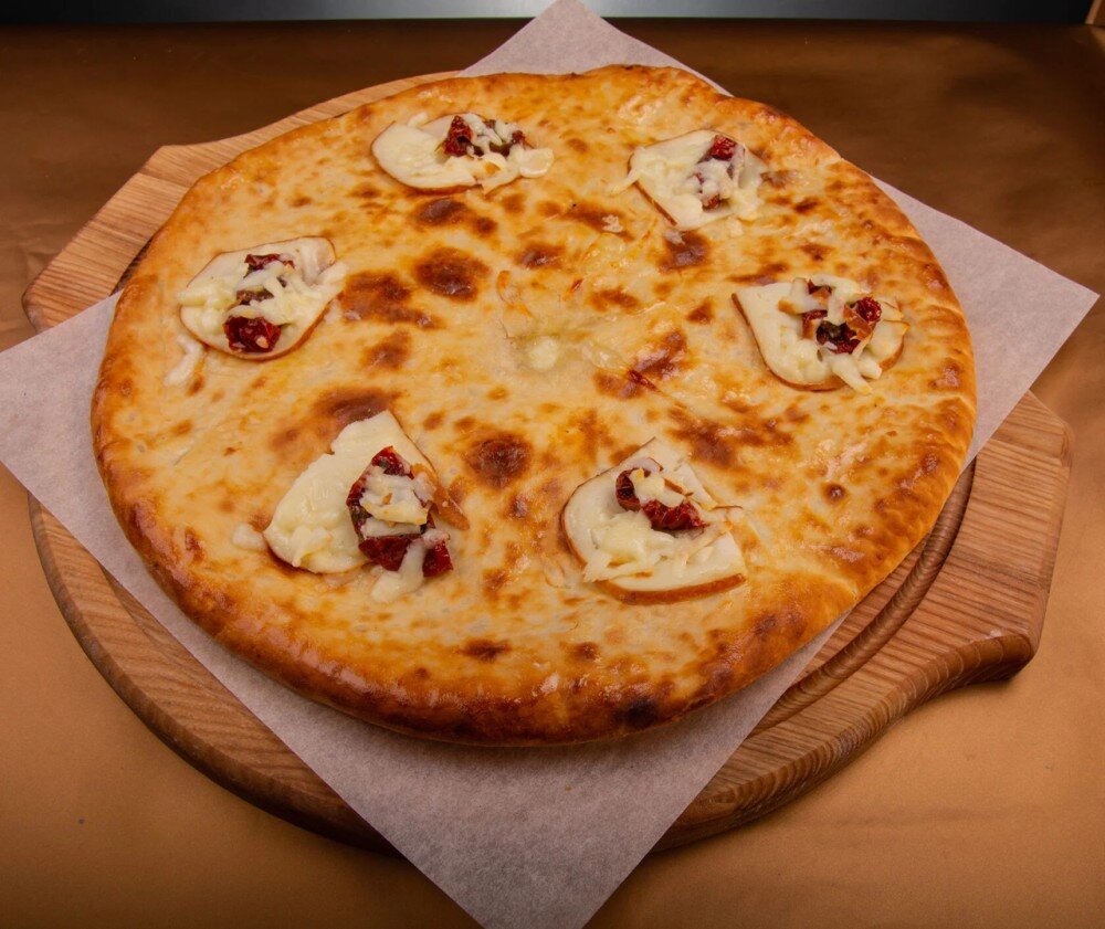 Пышное тесто для хачапури , сыр сулугуни, копченый сыр сулугуни, вяленые томаты, орегано. Диаметр: 32 см.
