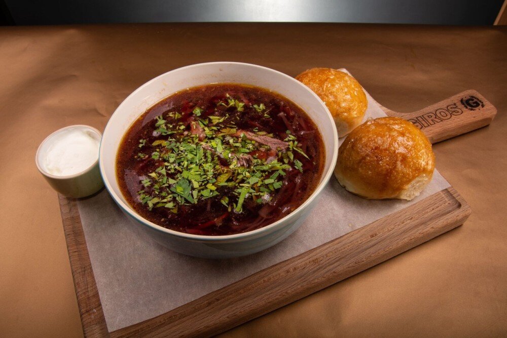 Говядина, домашний говяжий бульон, овощи, свежая зелень, сметана, две пампушки с чесноком