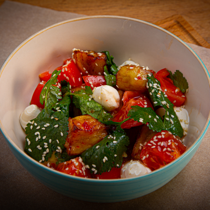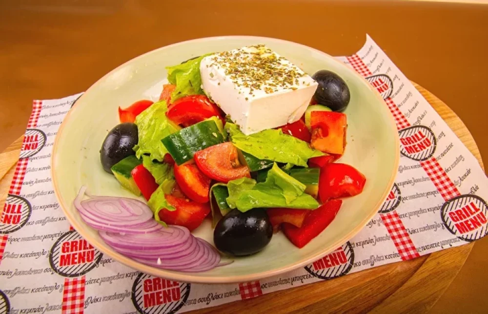 Огурец, помидор, лук красный, перец парика, лист салата, сыр "Сиртаки", маслины Гигант с косточкой, оливковое масло, орегано