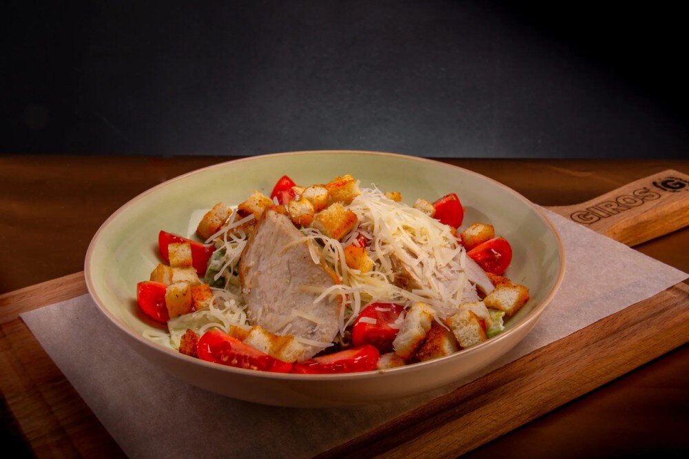 Куринная грудка, лист салата, салат айсберг, помидор, пармезан, сухарики, соус цезарь